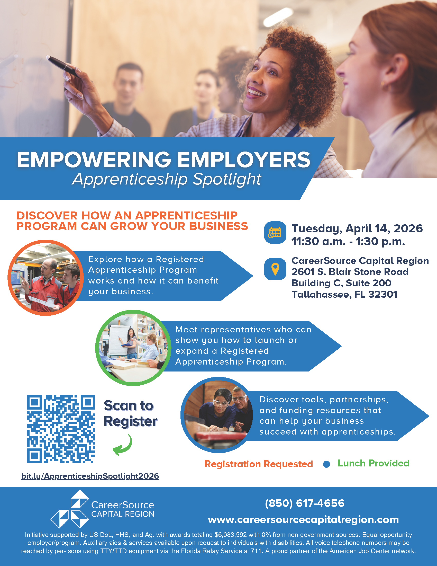 Join CareerSource Capital Region for the Apprenticeship Spotlight, created to help employers understand the value of registered apprenticeship programs. Gain practical insights, guidance, and resources to build a future‑ready workforce.